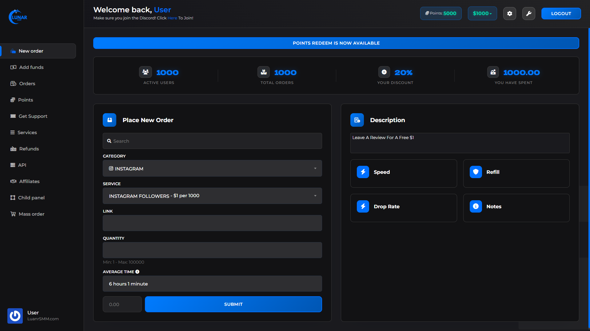 LunarSMM offers an extremely user-friendly dashboard that allows you to manage your orders, track progress, and view your transaction history with ease. Effortlessly browse our thousands of services and find what you need to get started growing your presence on social media quickly and efficiently.